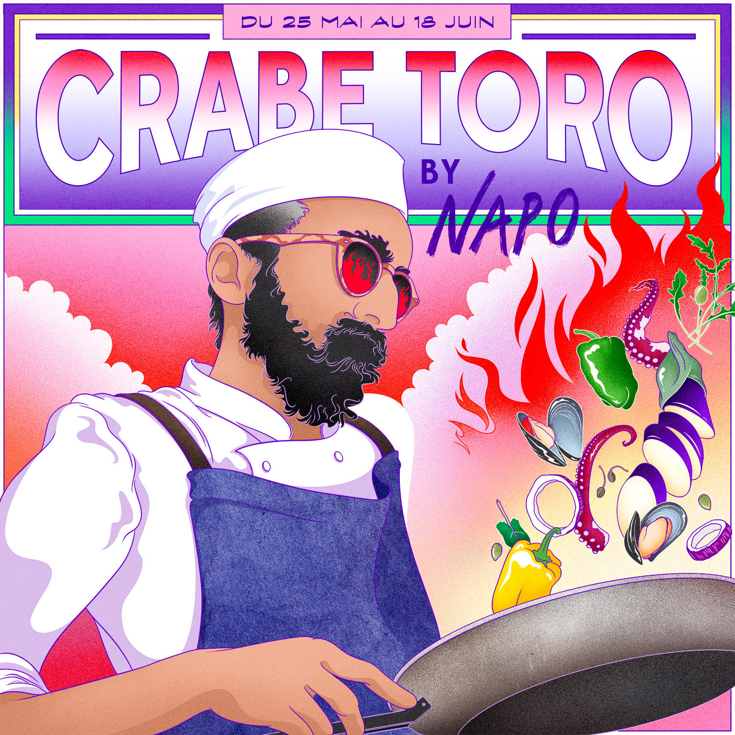 Commande personnalisée réalisée pour le restaurant marseillais Crabe Toro, pour la communication autour du changement de chef durant l'été 2022.