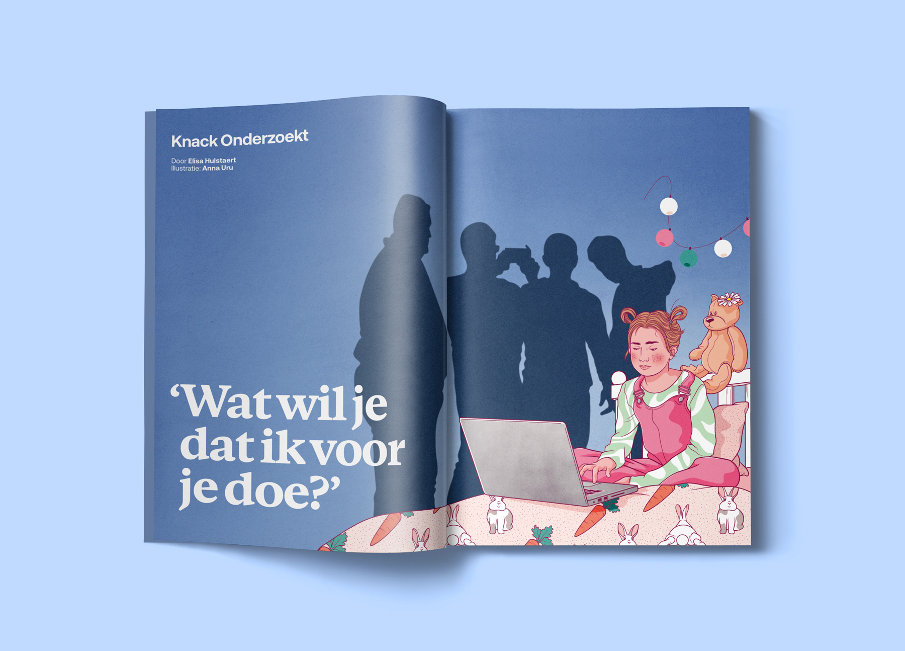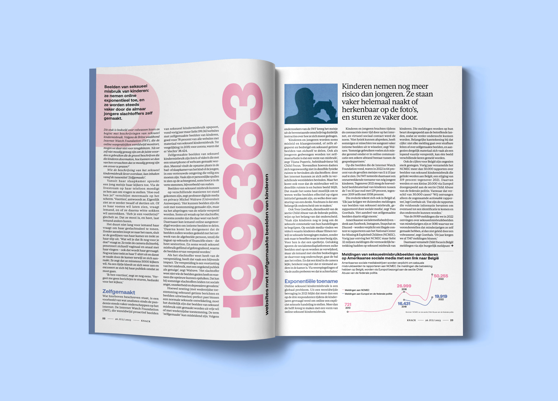 Couverture de l'hebdomadaire belge Knack abordant le sujet de l'augmentation sur internet des images d'abus sexuels sur les enfants depuis la pandémie, et comment ceux-ci se retrouvent souvent eux-mêmes les auteurs de ces clichés.