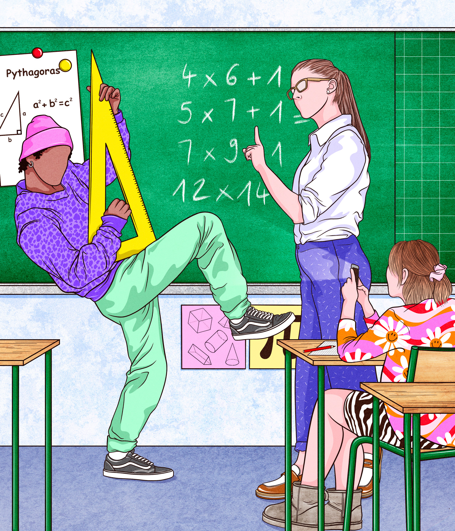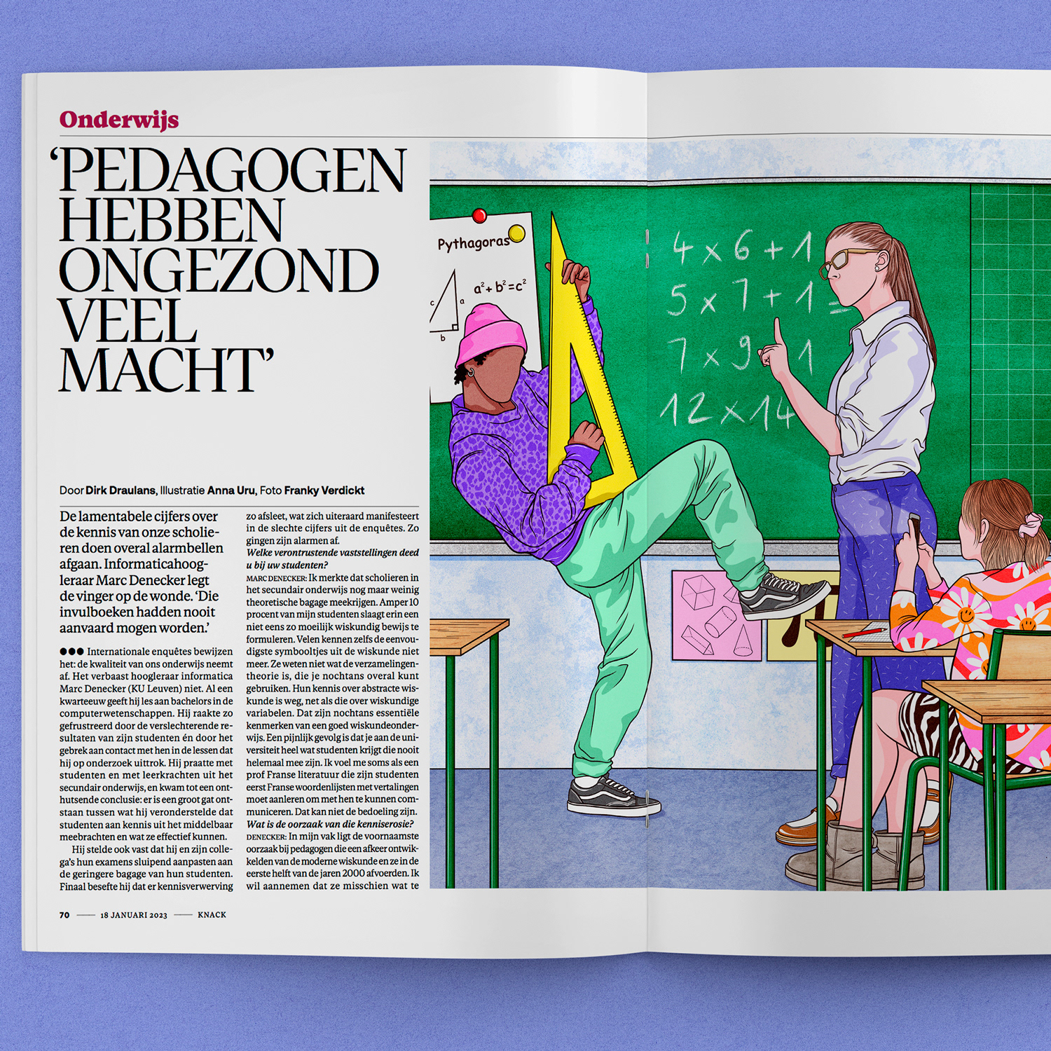 Illustration réalisée pour un article de l'hebdomadaire belge Knack, présentant l'interview d'un professeur de mathématiques qui déplore la baisse de niveau de ses étudiants et qui tente d'expliquer pourquoi selon lui nous en sommes arrivés là.