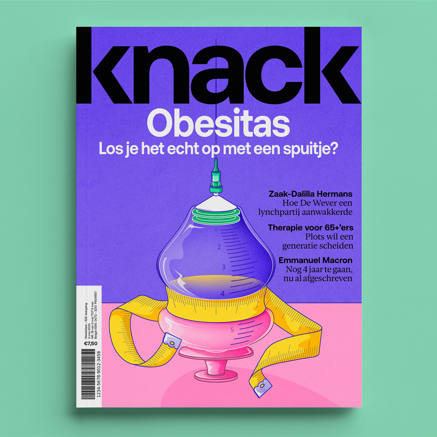 Couverture de l'hebdomadaire belge Knack, enquêtant sur les dangers d'un nouveau médicament injectable pour lutter contre l'obésité en Belgique.
