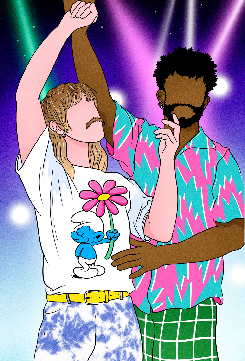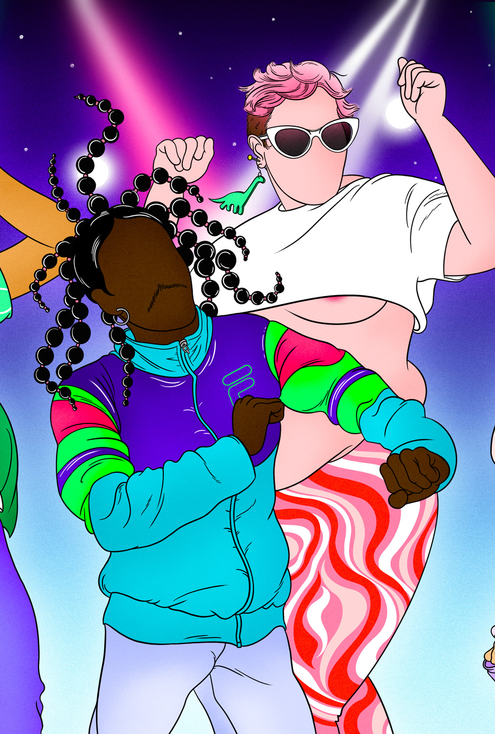 Création d'une série de 4 illustrations originales sur le thème de la fête, pour l'espace bar/discothèque du Lieu Unique à Nantes. Les illustrations sont imprimées indépendemment les une des autres sur des flyers, et créent une fresque lorsqu'on les regroupe les un à côté des autres.